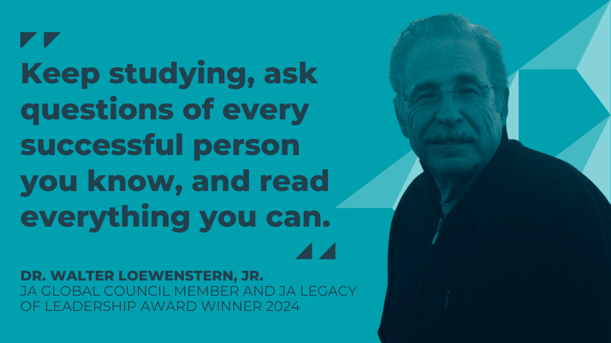 Last month, JA honored Global Council member and longtime JA supporter Dr. Walter Loewenstern, Jr., with the prestigious JA Legacy of Leadership Award, a testament to his remarkable contributions to JA and his enduring legacy. The award honors those who have dedicated much of their lives to making JA what it is today, like past honorees Patricia L. Francy and William Schawbel.